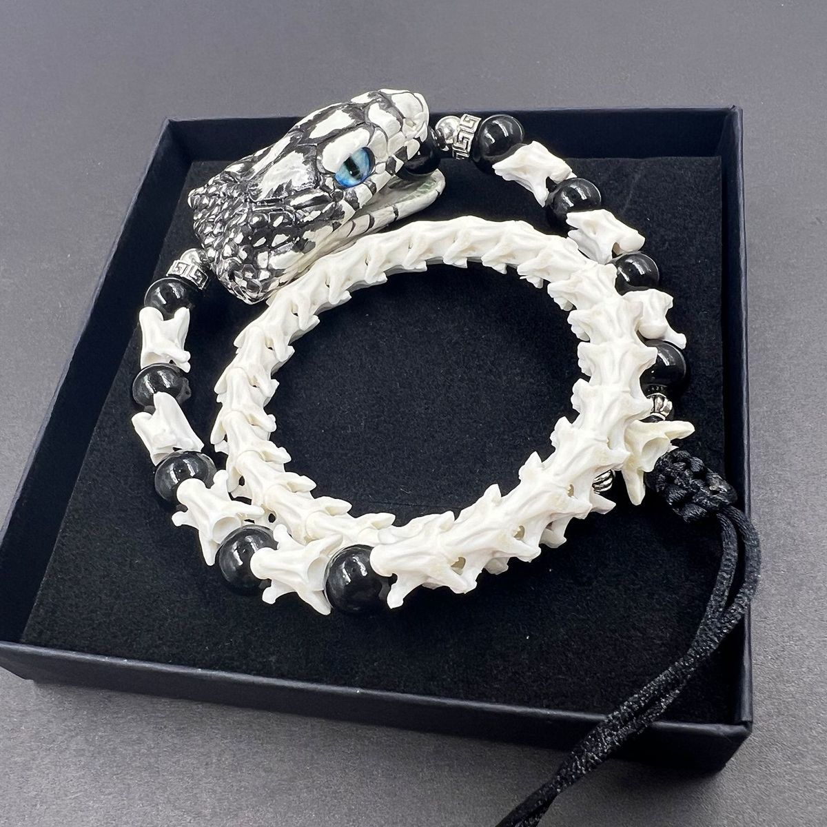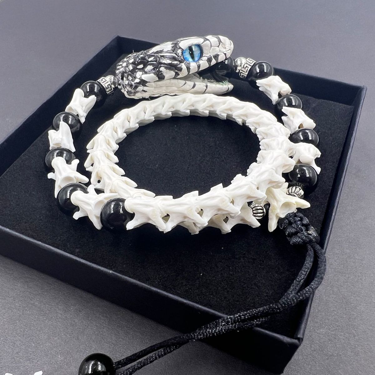 All snake bones used in our pieces are ethically sourced from certified, licensed breeders. The snakes were humanely raised in captivity and died of natural causes. Each bone undergoes meticulous hand-sanitization, polishing, and careful selection for optimal density, ensuring that every bracelet is not only unique but also safe and durable for daily wear.